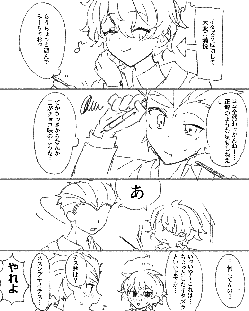 集中しすぎて食べ物を口に運ばれても気にせず食べちゃうシチュエーションが大好きなので、駿素にやってほしい 駿くんがテスト勉強会で頑張ってるところを見て素羽ちゃんが持ってきたポッキーとか口に運ぶんだけど、そのまま食べちゃうから面白くなって2本目……3本目……ってしてたらそのうち気付かれて「何してんの……?」ってお互い顔真っ赤になるところが見たい(妄想ツイート原文ママ)